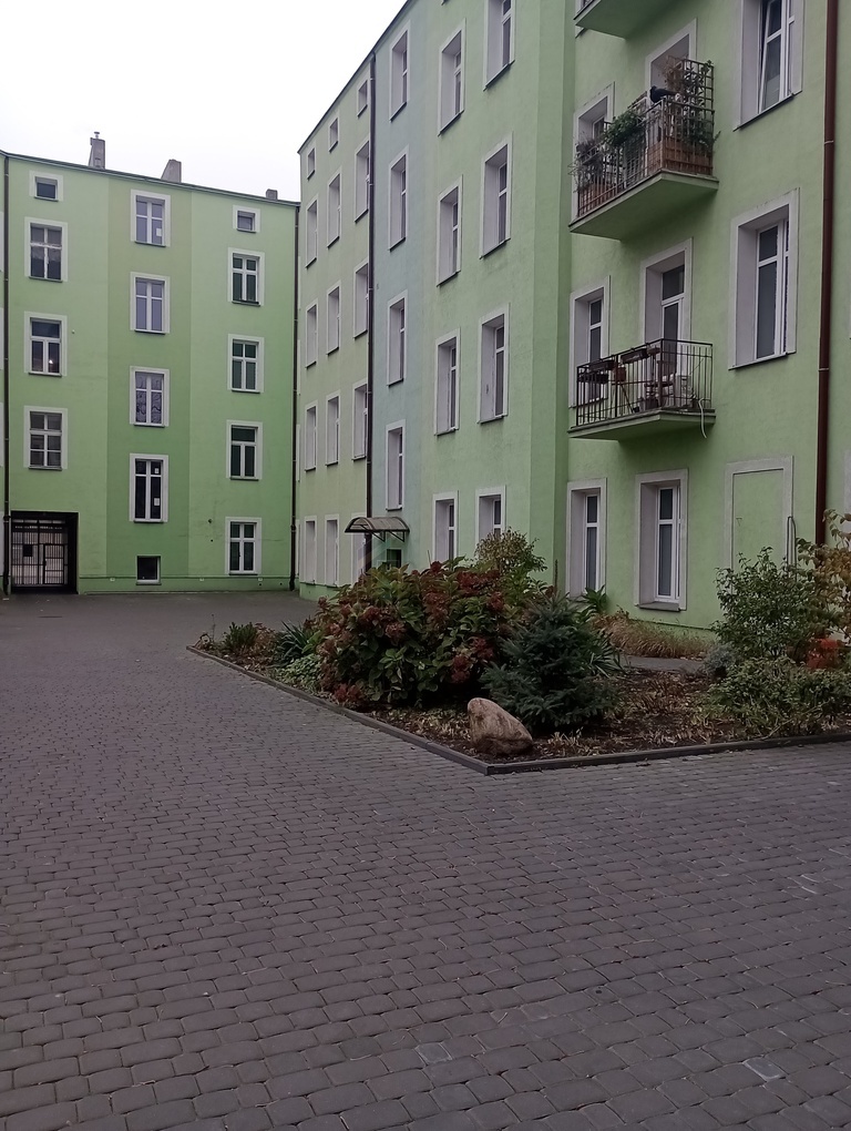 Elewacja budynku - po remoncie , klatka schodowa czysta, zadbana. Wokół budynku podwórze pokryte kostką brukową , z częścią zieloną oraz miejscami postojowymi i garażem.